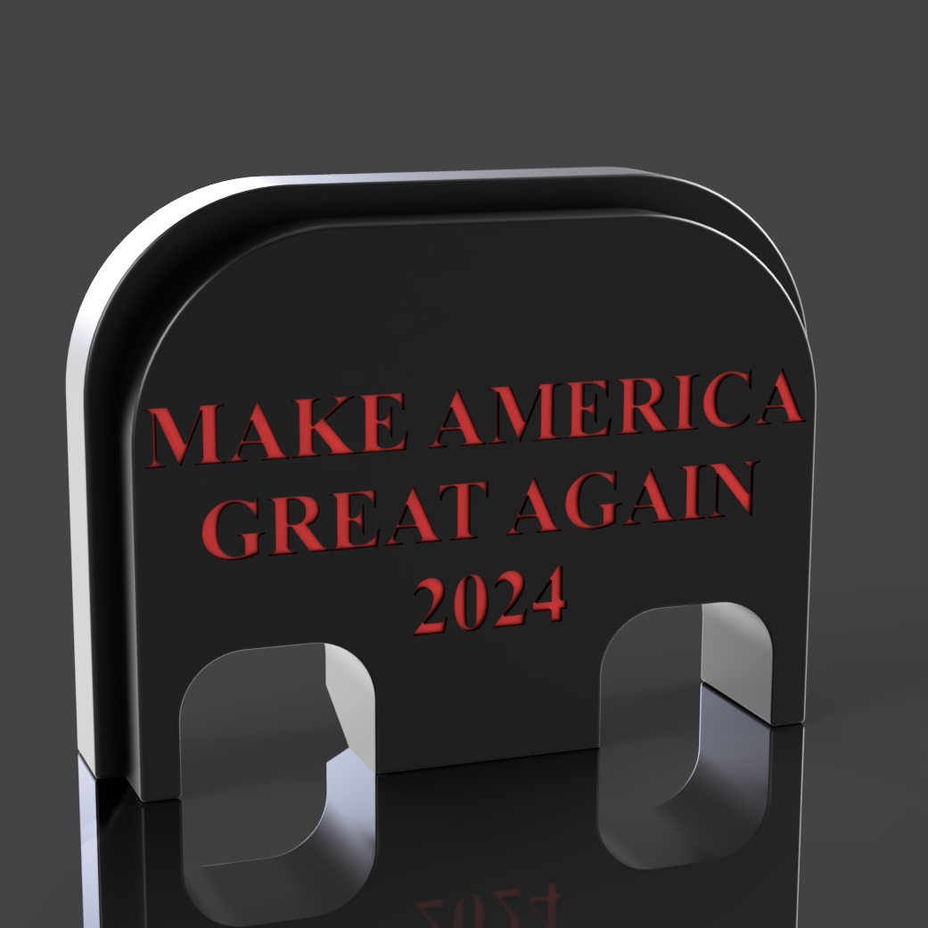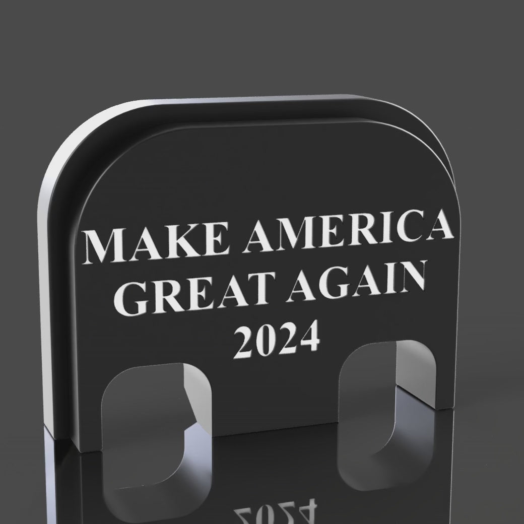 Support President Trump and the MAGA movement with our "Make America Great Again 2024" Glock slide backplate. This custom Glock backplate is CNC Machined precisely to ensure an OEM Glock fit. It features the iconic slogan for patriotism, strength, and a renewed American spirit. Whether you're a proud supporter of Donald Trump or a defender of the Second Amendment, This Glock backplate is the perfect addition to your pistol. This Glock slide backplate is a must-have accessory for anyone passionate about making America great again. Show it off proudly at the range and show your commitment to the movement with this high-quality Glock upgrade.