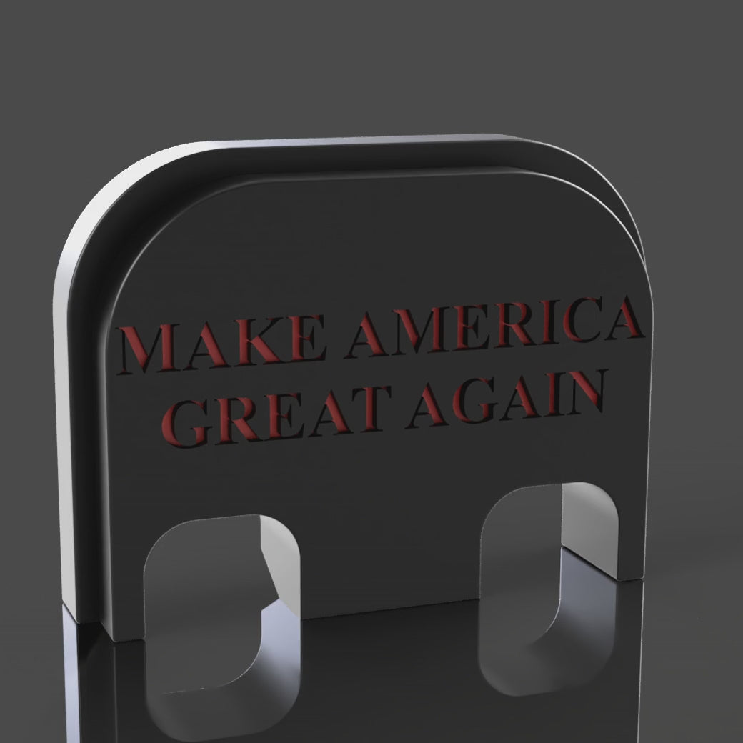 Support President Trump and the MAGA movement with our "Make America Great Again" Glock slide backplate. This custom Glock backplate is CNC Machined precisely to ensure an OEM Glock fit. It features the iconic slogan for patriotism, strength, and a renewed American spirit. Whether you're a proud supporter of Donald Trump or a defender of the Second Amendment, This Glock backplate is the perfect addition to your pistol. This Glock slide backplate is a must-have accessory for anyone passionate about making America great again. Show it off proudly at the range and show your commitment to the movement with this high-quality Glock upgrade.